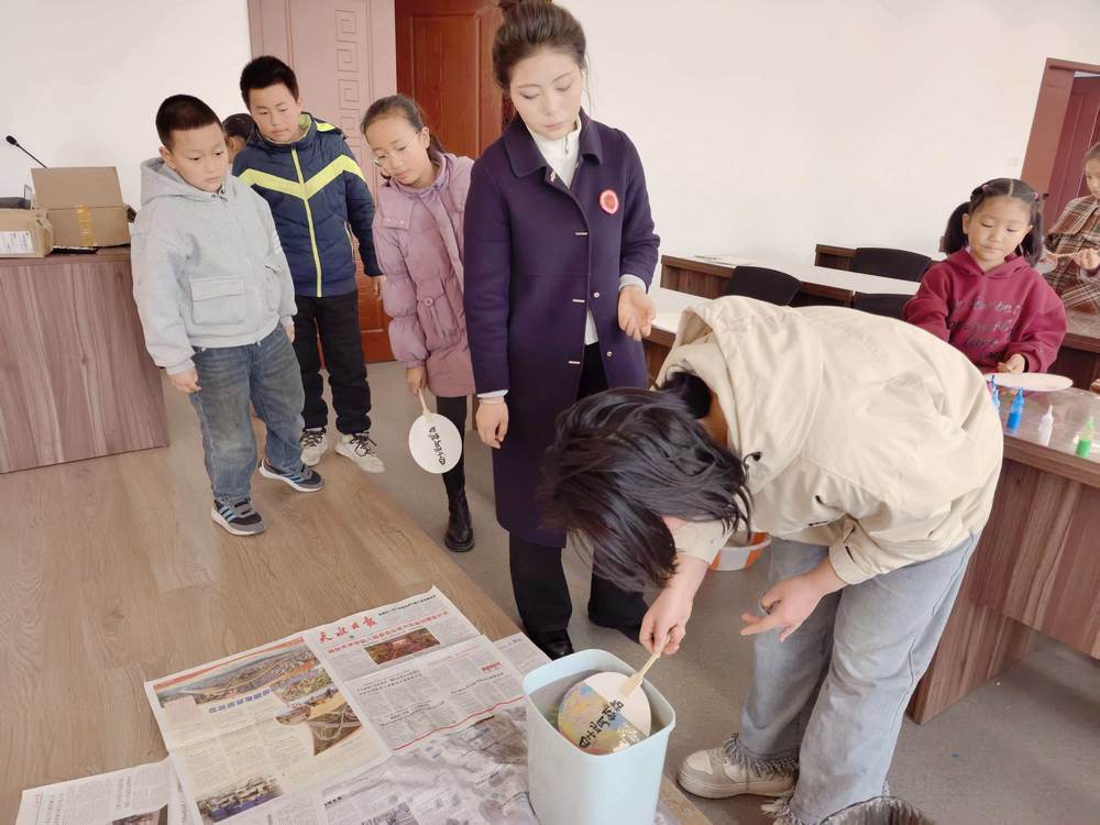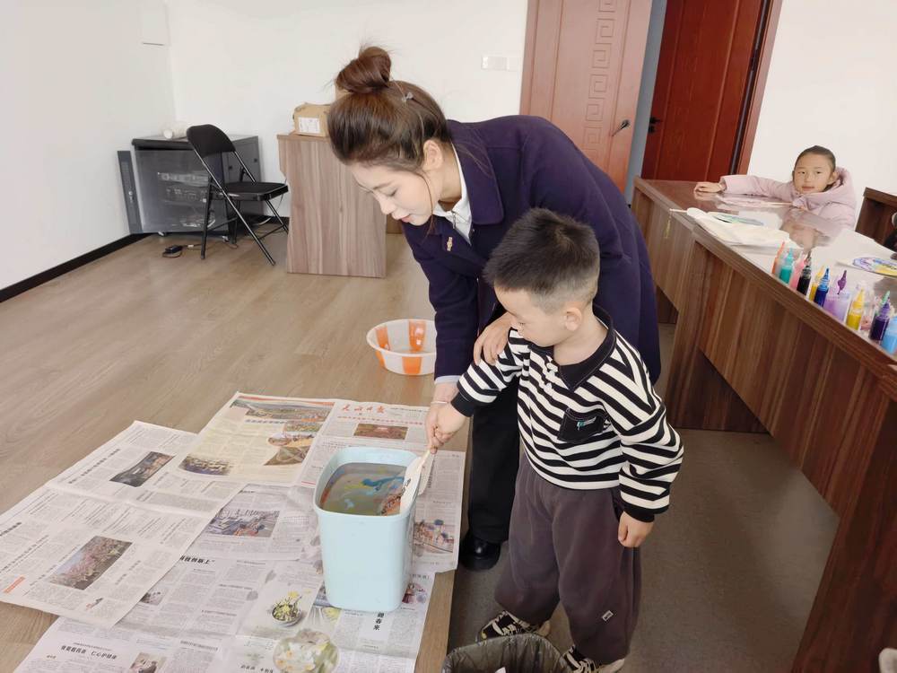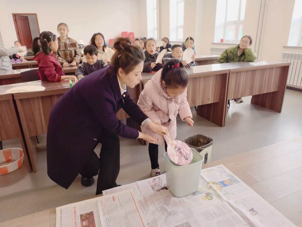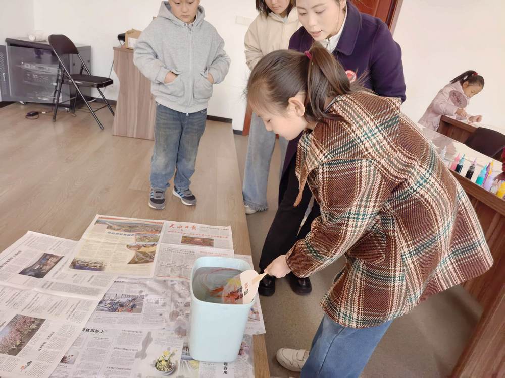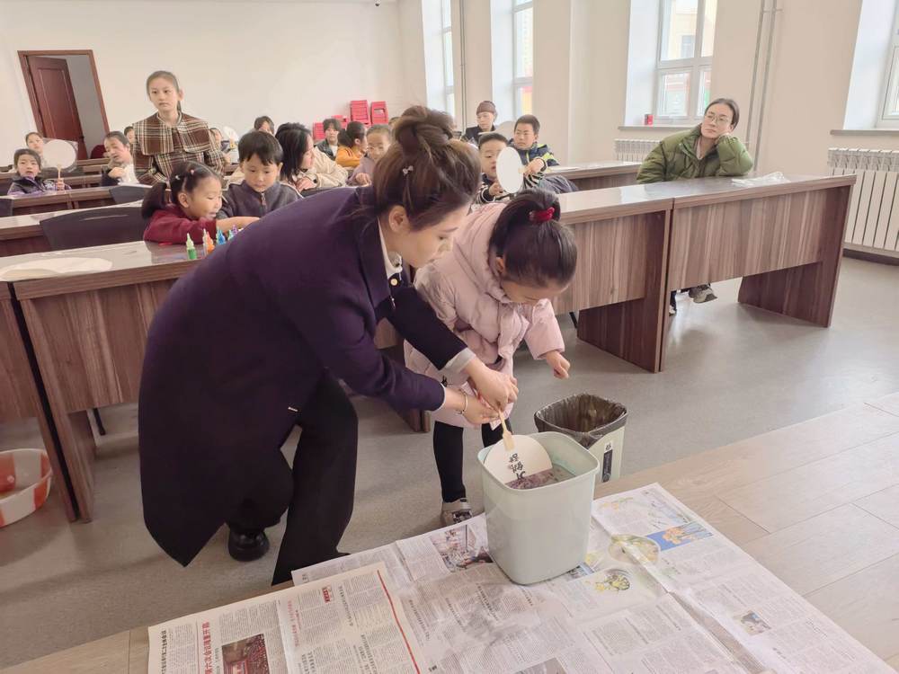 随后,社教老师为大家介绍漆扇的历史渊源与非遗价值,讲解环保漆料的特性、使用方法及安全注意事项,现场示范漆扇制作全流程:从滴漆配色、扇面晕染,到纹饰点缀、吸水定型,一步步演示晕染手法,在老师的鼓励下,同学们大胆尝试,彩漆在水面晕开如祥云,孩子们屏息凝神,将素白扇面缓缓浸入水中,轻轻转动,提起来时,绚丽的色彩与与骏马元素融合成独一无二的新春祝福。
